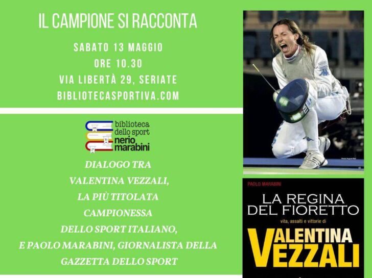 Quale è il segreto per vincere 6 ori olimpici? Come si fa a restare in testa alla classifica mondiale per 500 settimane consecutive? Cosa bisogna fare per vincere 11 volte la Coppa del Mondo? E dove si trovano motivazione ed energie per vincere un titolo mondiale a soli 4 mesi dal parto? Lo scoprirà chi vorrà partecipare come pubblico in sala al dialogo in punta di fioretto tra la pluridecorata nella specialità Valentina Vezzali e il giornalista della Gazzetta dello Sport Paolo Marabini, sabato 13 maggio alle 10.30 presso la Biblioteca dello Sport di Seriate dedicata da quest’ultimo alla memoria del padre Nerio.