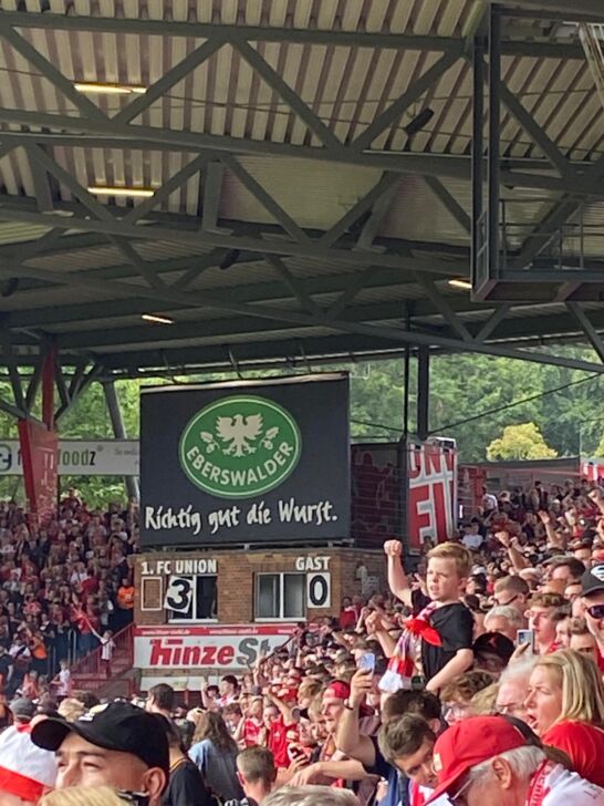 Ancora, la zona antistante le gradinate, gremita di postazioni dove comprare birra, würst e frittelle, gestita da esercenti facenti parte dei sostenitori della squadra e quindi interni alla società (non come i baracchini nei piazzali degli stadi come da noi, insomma) e che diventa, prima e dopo il match, una scusa per passare il resto della giornata allo stadio con famiglia e amici: le file per accaparrarsi un panino e una birra sono chilometriche ancora un paio d’ore dopo il triplice fischio dell’arbitro ed è molto divertente stare a un tavolo a veder passare una umanità variegatissima e intergenerazionale, con anziani, bambini, famiglie, ragazze tutti bardati di rosso e bianco (o del verde della nuova e bellissima terza maglia dell’Union) che ridono e scherzano in un gigantesco terzo tempo.