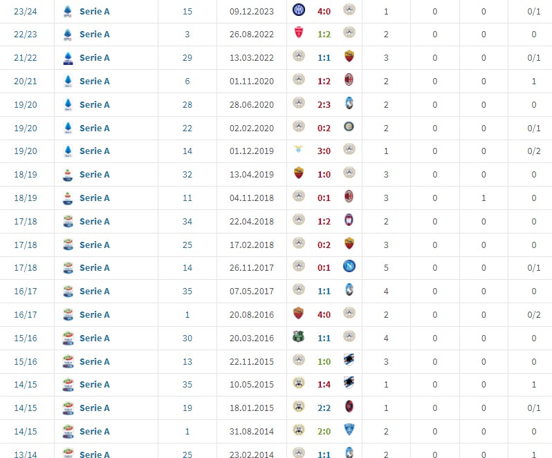 I nerazzurri, su 20 partite dirette da Di Bello, ne hanno vinte la metà, l’ultima nel quarto di Coppa Italia il 10 gennaio scorso a San Siro col Milan (2-1 in rimonta; Leao e doppietta di Koopmeiners, il secondo gol su rigore) con 3 pari e 7 ko. Le Zebrette, stesso numero di gare arbitrate, ne hanno invece perse ben 12 vincendone soltanto 3, Empoli e Samp in casa e più recentemente a Monza nell’agosto di due anni or sono come si evince dagli screenshot da Transfermarkt.