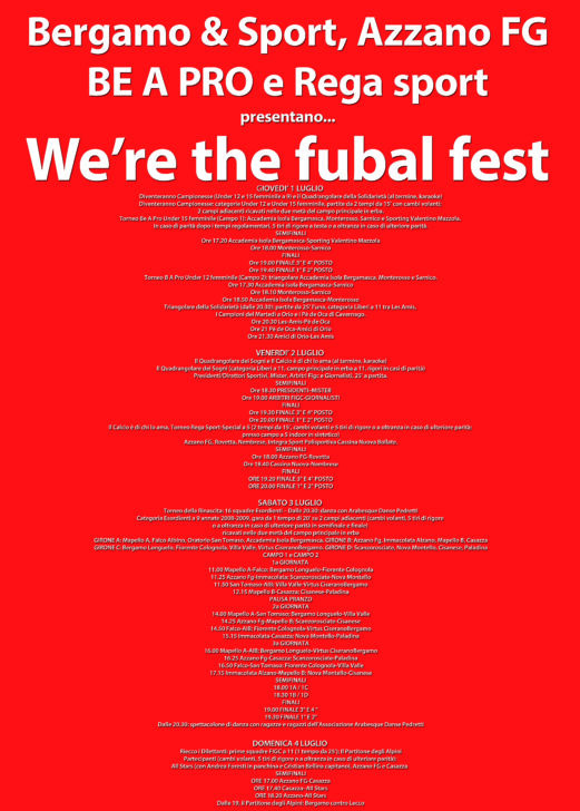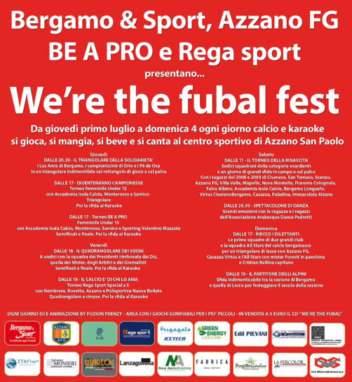 Dall’inno, col ricavato del cd inciso dai nostri campionati da destinare a opere di solidarietà, fino al calcio giocato, al Centro Sportivo di Azzano San Paolo, il passo è più breve di quanto si pensi. Pronti. Innanzitutto, i grandi numeri: 50 partite, 23 società dilettantistiche coinvolte, squadre libere a 11 di amici, simpatizzanti. Provateci voi, nell’estate numero 2 del liberi tutti post pandemia, con la gente che muore dalla voglia di farsi una vacanza la qualunque, staccando la spina dopo mesi divisi tra restacasismo quasi obbligato, sortite magari solo per la spesa grossa e il lavoro. Col coprifuoco a incombere. Il pallone, però, rotola più forte di tutto e più veloce di prima, specie per chi lo ama e per quelli che si mettono d’accordo per celebrarne la rinascita. E allora ecco quattro giorni di gioia e di ritorno alla socialità come la intendiamo noi calciofili. Tra tornei al ritmo di un paio a rotazione terrestre, gonfiabili per i più piccoli, karaoke per tutti, uno spettacolo di danza e l’immancabile servizio di ristorazione sempre attivo. L’Azzano FG e Bergamo & Sport, affiancato da partner come Be A Pro, il nuovo social network per addetti ai lavori, e Rega Sport, in collaborazione col Centro Sportivo Italiano di Bergamo che fornisce gentilmente tutti gli arbitri per la manifestazione, calano il poker da giovedì 1 a domenica 4 luglio col ricchissimo programma di We’re the Fubal Fest, in onore di un intero movimento ai nastri di ri-partenza. Provate a leggerlo tutto d’un fiato: quando Maurizio Mangili, il responsabile eventi AFG, da dirigente di lunghissimo corso ci ha mandato il malloppone di regolamenti e calendari, l’abbiamo schematizzato per voi. Ci sono Cristian Bellina con le sue All Stars, gli arbitri Figc contro i giornalisti, la chiusura con gli Alpini bergamaschi contro i lecchesi. Day after day, la nuova socialità e la condivisione di valori, fair play, sfera di cuoio, partitissime per cui perdere la voce, salamelle e birrozze, ce le mangeremo e berremo alla salute di tutti.